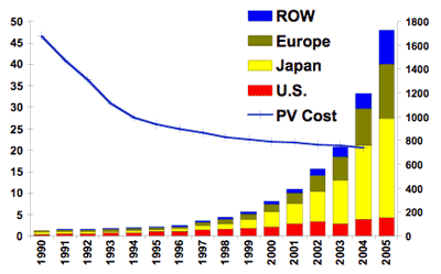 The data source is provided by PV News, Volume 25, Number 3, March 2006, published by the Prometheus Institute for Sustainable Development, www.prometheus.org, one of a handful of high quality web portals that provide top quality news on real technical breakthroughs and major commercial announcements