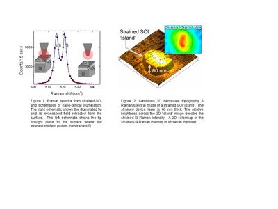 Recently, in our labs at the College of Nanoscale Science & Engineering at the University at Albany, SUNY we have demonstrated the proof-of-feasibility of this approach on large-scale strained-Si test structures. Figure 1 gives a simple schematic of this approach. The test structure consists of a so-called ‘silicon-on-insulator' or SOI stack. This stack separates the Si device layer (top strata) from the bulk Si wafer by a buried silicon oxide layer. For these particular stacks the top Si layer is actually strained to improve charge mobility. The higher strain in the device layer is seen very clearly in the Raman spectra from this structure. Normally there would only be a single peak in the Raman spectrum at 521 cm-1. For the strained SOI stack this peak splits into two (Fig. 1). The Raman peak at lower wavenumber corresponds to the strained Si on the surface. When an illuminated metallic tip is brought within a few nanometers of this surface (left schematic in Fig. 1) the evanescent field of the tip generates Raman-shifted photons. When the tip is retracted (right schematic in Fig. 1) only ‘far-field' Raman-shifted photons are generated. The difference between the Raman spectra for these two tip configurations enables us to generate a nanometer-scale map of the strain.