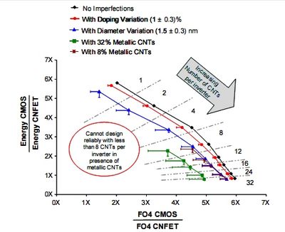 | Relationship of delay and energy tradeoffs normalized to CMOS of a CNT based inverter. |