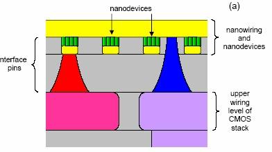 | Cross bar architecture with bi-state molecules self-assembled at crosspoints. Lines are 16nm wide. |