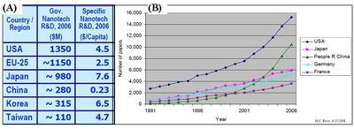 Although Japan is a major player in nanotechnology development, the US still leads nanotechnology funding and the production of scientific journal papers (see Fig 1). China however, just like its sky high GDP growth, is quickly producing a large amount of nanotechnology peer reviewed papers, and if extrapolated, will surpass the US in the coming years (Fig 1).