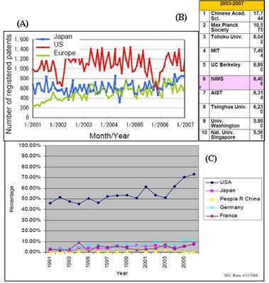 An indicator of nanotechnology leadership and innovation can also be taken by the number of registered patents in each region as shown in Fig 2a. Normalizing the data to "per capita" would make Japan the front runner. However, if we break down the institutional citation rankings in "material science" (Fig 2b), one unravels that the China Academy of Science's leads the race in quantity. But when presenting the data (Fig 2c) on an aggregate, M. Rocco shows that the US leads rankings in nanotechnology papers published in Science, Nature and PNAS.