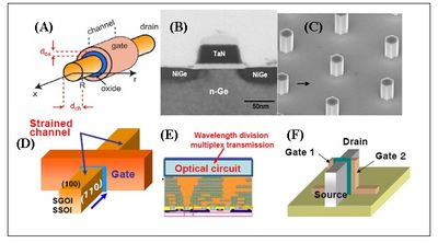 Another major theme was nanoelectronics, in particular focusing on new memory and logic devices. Groups such as Selete, Toshiba and IBM and Intel presented various technologies that are being investigated in pushing CMOS to its limits as shown in Figure 4. Solutions included use of (a) nanowire FETs to achieve ultimate electrostatic control of channel carrier depletion, (b) Ge based FET with shallow source/drain to mitigate short channel effects, (c) III-V nanowire on Si solutions, (d) strained channel FINFETs, (e) optical based interconnect solutions and (f) 4 terminal FET structures and geometries.