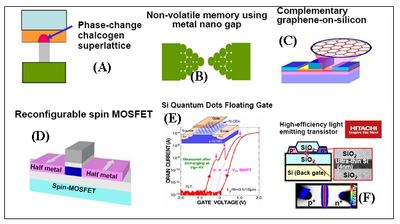 However going beyond CMOS was discussed with more vigor and need. The challenges that face nanoelectronics, in particular the search for a new logic and memory device was summarized via six research needs, these include the search for 1) New state variables other than charge (to reduce energy), 2) devices that operate out of equilibrium with the thermal bath (to reduce noise and energy), 3) information transfer mechanisms that are not electromagnetic in nature (for interconnection purposes), 4) phonon engineering for advanced thermal management (to improve heat dissipation) 5) directed self-assembly (to reduce cost) and 6) emerging architectures (for higher functionality). A variety of technologies as shown in Fig. 5 highlight technologies that target these research vectors. Some of these include a) new state variables such as phase change devices, b) new switched that exhibit high Ion/Ioff, c) ballistic based transistors using graphene, d) spin based devices that can incorporate both memory and logic functionality e) quantum dot based floating gate memory devices and (f) high efficiency light emitting diodes using exotic III-V materials.