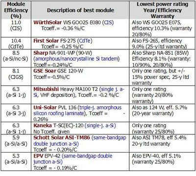 | Solar Module (Panel) Efficiencies April, 2008 |