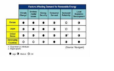 What is apparent from the table above is that there is a strong "push" in developed countries towards renewable energy due to environmental and regulatory issues and there is a strong customer "pull" for alternate energy sources in the developing world. It is anticipated that in the absence of grid-parity, demand for renewable energy would remain low in these regions. Southern Europe and US would be see increasing demand as they try and catch up with the current leaders i.e. Germany and Japan.