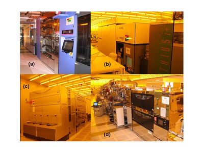 | Figure 2: Four of the CNSE photon based lithography tools built by ASML with resist tracks from Tokyo Electron. (a) – (c) are 3 generations of 193nm DUV, water immersion systems while (d) uses 13.5nm EUV photons. |