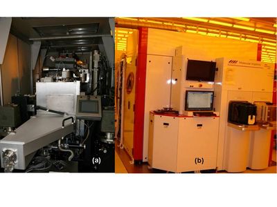 | Figure 3: Two non-photon based lithography systems at CNSE. (a) Vistec VB300 electron beam system. (b) Molecular Imprints Imprio 300 nanoimprint system. |