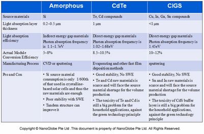 | Table 2. Comparison table for the amorphous-Si, CdTe and CIGS thin film solar cells. (Source: NanoGlobe Pte. Ltd.) |