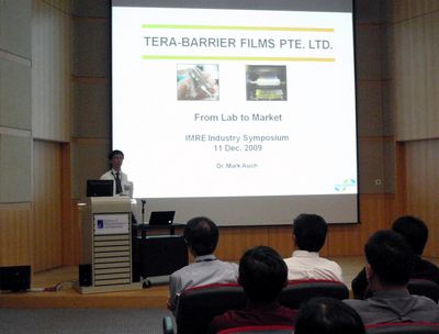 Over 100 participants mostly from industry were invited to participate in half-day forum of IMRE Industry Day on 11 December 2009. IMRE scientists presented four different areas of development, namely Light and Energy, Medical Technology, Advanced Materials, and Advanced Fabrication Techniques. Towards the end of the event, Tera-Barrier Films Pte Ltd, a third spin-off from IMRE shared their experience on lab-to-market, transitioning from scientists to executives and business developers.