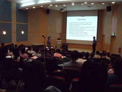 The workshop mainly presented the technical details of research progress and results including new materials synthesis, transport mechanisms, new materials properties, new fabrication process, and device characterization and optimization. Substantial time is devoted to develop solution processable materials for dielectrics and low band gap polymers for OPV application. For example, oleic acid-capped perovskite(e.g. BaTiO3, SrTiO3) nanoparticles exhibit high k value (4-12) making them promising materials for dielectric application for organic thin film transistors. As explained by Dr Mary Chan, Associate Professor in Nanyang Technological University, the nanoparticles suspensions are stable due to the presence of oleic acid, and therefore they be processed with simple spin-coating and printing method. Dr Chen Zhikuan, Senior Scientist at IMRE, shared a series of new low bandgap polymers, promising for organic photovoltaics application. He showed that the new polymers (based on phenyl butyric acid methyl ester) are capable of producing power conversion efficiency of more than 5%.