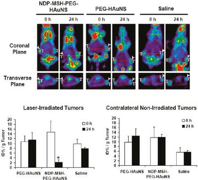 | Figure 1. In vivo PTA with targeted NDP-MSH-PEG-HGNs induced selective destruction of B16/F10 melanoma in nude mice.PET imaging shows significantly reduced metabolic activity in tumors after PTA in mice that were pretreated with NDP-MSH-PEG-HGNs but not in mice pretreated with PEG-HGNs or saline.PET was conducted before (0h) and 24 h after NIR laser irradiation (0.5 W/cm2 at 808nm for 1 min), which was commenced 4 h after iv injection of HGNs or saline (T for tumor). The arrowheads in the figure indicate tumors irradiated with near-IR light. [18F] fluorodeoxyglucose uptakes (%ID/g) before and after laser treatment are shown graphically at the bottom. Bars, SD (n=3). * P<0.01 for %ID/g posttreatment versus %ID/g pretreatment. HAuNS or HGNs termed in this original work are the same as HGN. The number of NDPMSH-PEG-HGNs per mouse is around 2.5E12. (Ref 1) |