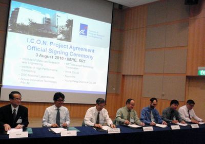 The launch was marked by the signing of project agreement by the consortium project partners, which, in addition to IMRE, consists of Institute of High Performance Computing (IHPC), DSO National Laboratories, Solves Innovative Technology Pte Ltd (all of which are Singapore entities), NTT Advanced Technology Corporation and Innox Co Ltd (Japan), Nypro Inc (USA), and Youngchang Chemical Co Ltd (Korea). The consortium embraces total value chain involved in NIL, namely from tools (both for R&D and production), resist materials, templates (mould/stamp) to process know-how and applications. Currently, I.C.O.N. has defined two thematic application-oriented projects to be pursued namely Anti-reflection structures and Anti-bacterial structures.