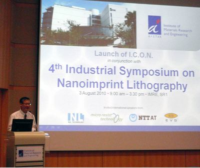 Creating nanopattern on substrate surfaces to obtain certain functionality without additional materials is one significant capability of nanoimprint lithography (NIL). Although it is originally invented for semiconductor and data storage industries, nowadays NIL has been receiving more attentions from wider range of industries including consumer electronics, health care, food packaging, solar, MEMS/NEMS, as well as aerospace and automotives. Singapore Institute of Materials Research and Engineering (IMRE) has established itself as one of the world leaders in progressing NIL technology, under the leadership of Dr Low Hong Yee, for wide industrial adoption. Propelled by the increasing number of industry players interested in NIL and potential converging themes for industries to work together, Industrial Consortium on Nanoimprint (I.C.O.N.) was finally formed by IMRE and supported by the governmental agencies (Singapore EDB, SPRING Singapore, and IE Singapore). It was launched in conjunction with the 4th Industrial Symposium on Nanoimprint Lithography on 3rd August 2010. As part of nanomanufacturing enabling technology, I.C.O.N. will focus on nanostructuring for nanosurfaces, explained by Dr Low.