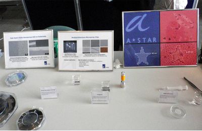 | Exhibition of products, produced by the NIL group in IMRE, including gecko structures, hologram surface, 20nm line & space gratings, and high aspect ratio AAO |