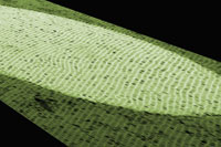 | Experiments by scientists at the University of Chicago and Argonne National Laboratory have revealed how to drastically change the properties of certain materials by confining their molecules in nanospaces. This false-color image taken via a transmission electron microscope shows a transparent sheet of closely packed gold nanoparticles separated by organic spacers. The sheet lies atop a silicon chip. The light green area is where the sheet covers a hole in the silicon chip (Image courtesy of Klara Mueggenburg and Heinrich Jaeger). |