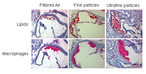 | Red staining in sections of the aorta represents lipid and macrophage content, which are part of the atherosclerotic plaque development. Exposure to ultrafine particles shows highest degree of plaques. |