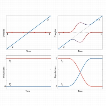 | Figure 1: The slow and robust transfer of a qubit from one quantum state (1) to another (2). The temporal evolution of the energy levels (upper panels) and the populations of those energy levels (lower panels) are shown for a two-state quantum system. The population transfer from one quantum state to another occurs only in the circuits with an electromagnetic (coupling) pulse (right-hand panels). |