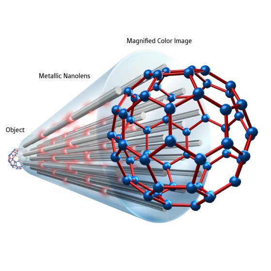 | Figure 1: A metallic nanolens. Plasmonic resonances along stacked silver nanorods are capable of long-distance image transfer and magnification. |