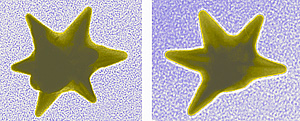 | NIST scientists found that gold and silver nanostars improved the sensitivity of Surface Enhanced Raman Spectroscopy (SERS) 10 to 100,000 times that of other commonly used nanoparticles. These uniquely shaped nanoparticles may one day be used in a range of applications from disease diagnostics to contraband identification. Color added for clarity.