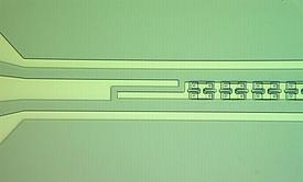 | In the JILA/NIST “noiseless” amplifier, a long line of superconducting magnetic sensors (beginning on the right in this photograph) made of sandwiches of two layers of superconducting niobium with aluminum oxide in between, creates a 'metamaterial' that selectively amplifies microwaves based on their amplitude rather than phase.