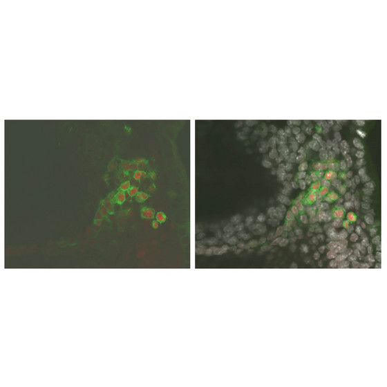 | Figure 1: Sox2 is among the genes upregulated by Blimp1 as part of the PGC developmental program. These cells have been fluorescently labeled to illustrate this process; Blimp1-expressing cells are labeled green, Sox2 protein is labeled red. In the right panel, cell nuclei have also been labeled with a generic staining agent and pseudo-colored white to reveal all individual cells in the specimen. Shown is a posterior part of a day 7.5 embryo. |