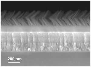 The seven layers, each with a height of 50 nanometers to 100 nanometers, are made up of silicon dioxide and titanium dioxide nanorods positioned at an oblique angle — each layer looks and functions similar to a dense forest where sunlight is "captured" between the trees. The nanorods were attached to a silicon substrate via chemical vapor disposition, and Lin said the new coating can be affixed to nearly any photovoltaic materials for use in solar cells, including III-V multi-junction and cadmium telluride.