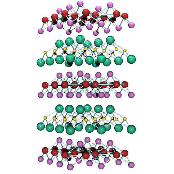| Figure 1: Structure of the iron-based superconductor SmFeAsO1-xFx: Fe (yellow), As (green), Sm (purple), O (red). The excess fluorine (F) substitutes for the oxygen sites. |