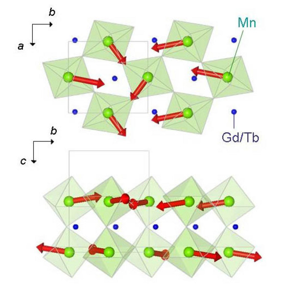 After careful analysis of over 150 neutron diffraction peaks, the team has determined that at temperatures close to ~20 K (~ -253 °C) the manganese (Mn) spins in Gd1-xTbxMnO3 spiral in the a-b crystallographic plane (Fig. 1). The team has also shown that the formation of this spiral-like magnetic phase occurs at the same temperature that the material develops a ferroelectric moment. Based on comparisons of this spin structure with that of TbMnO3 at zero field, in which the spins spiral in the b-c plane, the team argues that the electric polarization rotates 90 degrees in TbMnO3 in the presence of magnetic field because the field changes the sense of rotation of the spiral spin structure.