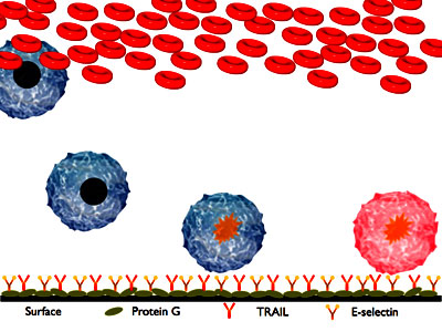 Once the cancer cells adhered to the selectin on the microtube's surface, King exposed them to a protein called TRAIL (for Tumor Necrosis Factor Related Apoptosis-Inducing Ligand), which binds to two so-called "death receptors" on the cancer cells' surface, setting in motion a process that causes the cell to self-destruct.