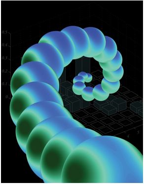 | A progression of squeezed triphoton states spiraling outwards. The quantum uncertainty in the triphotons can be represented as a blob on a sphere that becomes progressively "squeezed". Image Credit: Victoria Feistner |