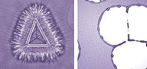| Crystallization (left) occurs as polymers harden into thin films, which are used widely in electronics technology. But when dewetting (right) also occurs, inhomogeneities in the film can degrade performance. NIST scientists found that temperature determines which process dominates film formation, and that keeping certain angles between crystallization fronts can largely prevent dewetting.