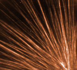 | Single wall carbon nanotubes enclosed in bile acid shells self assembled into a sheaf of long ordered fibrils each composed of several nanotube rods. Treating the microscope slide with a hydrophobic compound causes the fibrils to cluster like this at specific sites, probably at defects in the hydrophobic surface. Image, 70 micrometers wide, was taken using near-infrared fluorescent microscopy. (Color added for clarity.)