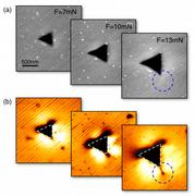 | Figure: Infrared visualization of nanocrack evolution. a) Topography of triangular indents (depressions) at the surface of a SiC crystal. Indentation was performed by pressing a sharp diamond tip into the crystal surface. With increasing force F, the depression becomes larger and deeper. b) The infrared near-field images recorded at about 10 µm wavelength clearly show the regions around the indent where the crystal lattice is compressed (bright) or stretched (dark). Because of the exceptional high spatial resolution, the images reveal the onset and formation of nanoscale cracks (marked by dashed blue circlse) when the indentation force is increased. Copyright: Andreas Huber, Max Planck Institute of Biochemistry, Martinsried |