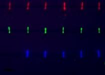 | Penn State These nanowires, tagged with DNA are assembled, and have been exposed to complementary DNA that is tagged with fluorescent dyes. |
