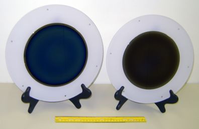 Our in-house tools include platters are sized at 5" through 12". Materials properties include n-type conductors doped to 10E20 with conductivities as low as ~5E-4 ohm-cm or insulating films at greater than 10E7 ohm-cm. We have experience with a wide range of dopants to tune band gap, index of refraction and conductivity. P-type exploration services are also available.