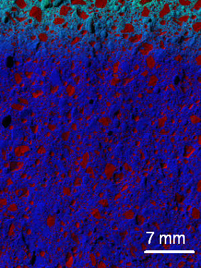 | The barely visible blue-green area at the top of this X-ray image of concrete with the NIST nanoadditive shows that very few chloride ions (in green) penetrate into the concrete.
