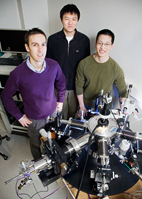 | Photo by L. Brian Stauffer Electrical and computer engineering professor Eric Pop, from left, worked with undergraduate Yang Zhao and graduate student Albert Liao, both in ECE, to demonstrate a remarkable increase in the current-carrying capacity of carbon nanotubes. |