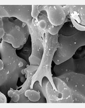 Nanopores, measuring just a few nanometers (billionths of a meter) in diameter, allow cells to adhere and bone material to crystallize. Macropores, with diameters of about one hundred microns (millionths of a meter) across, allow bone cells to grow inside the scaffold and to vascularize, or form new blood vessels and tissue.