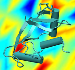 | Preservatives like sugar surround and protect complex molecules (foreground), but varying degrees of movement within the preservative—symbolized by the different colors in the background—are a major contributor to spoilage. Recent NIST findings concerning the fundamental behavior of mixtures (such as the combination above) could dramatically extend the shelf lives of vaccines and other biological materials.