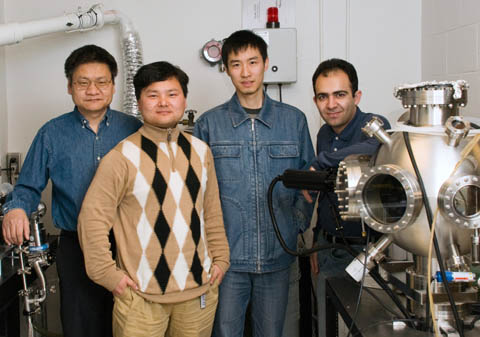 | TEAM NANOTUBE - Members of UNL’s Laser Assisted Nano-Technology Lab team who created self-assembling carbon nanotubes are (from left): professor Yongfeng Lu; post-doctoral researcher Yunshen Zhou; and graduate students Wei Xiong and Masoud Mahjouri-Samani. Photo by Greg Nathan/University Communications. |