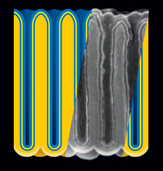 | Electrostatic nanocapacitors formed in nanoporous anodic aluminum oxide (darker yellow) film by sequential atomic layer deposition of metal (blue), insulator (yellow), and metal. Insert: cross-section of actual structure, represented as rescaled scanning electron micrograph. (A. James Clark School of Engineering, U-Md.) |