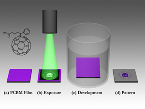| En PCBM-fullerenfilm målas ut på ett substrat. (b) Valda delar av filmen exponeras med laserljus (här via användande av en svart skuggmask). (c) Hela filmen framkallas genom att doppas i en framkallningsvätska. (d) Ett elektroniskt aktivt PCBM-mönster framträder där laserljuset träffat. |