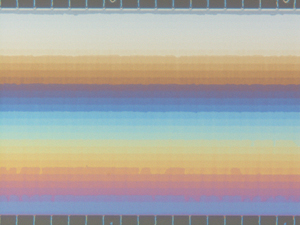 | Overhead view of the NIST-Cornell 3-D nanofluidic device showing the different depth levels within the chamber as horizontal bands. The deepest, at the bottom, measures about 620 nanometers (slightly smaller than an average bacterium), while the shallowest, at the top, is about 60 nanometers (1,000 times smaller than the width of a human hair). The colors of the bands result from different mixing of white light components (interference) at each depth. |