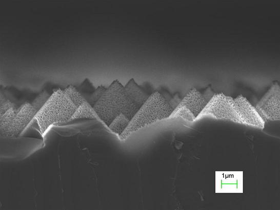 An e-beam process is then used to apply nanometer-scale gold particles to the pyramid structures. Using a solution of hydrogen fluoride (HF) and hydrogen peroxide (H2O2), a metal-assisted etching process - with gold as the catalyst - produces the nanometer-scale features. The feature size is controlled by the diameter of the gold particles and the length of time the silicon is exposed to the etching.