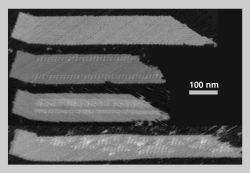 | Ribbon-like DNA tile crystals grown from DNA origami seeds. Credit: Caltech/Winfree, Rothemund, Barish, Schulman |