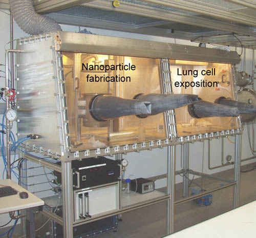 | Cell cultures of lung epithelial cells (in the right-hand box) were exposed to an aerosol of cerium oxide nanoparticles in a special glove box. During the exposure of the cell cultures, the nanoparticles were freshly produced by flame synthesis in the left half of the box. |