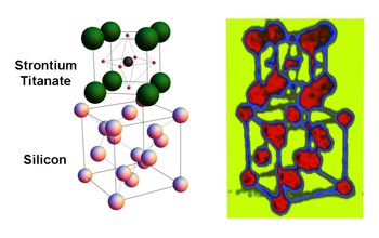 | Researchers report matching the spacing of silicon atoms--the principal component of computer semiconductors--and the spacing of atoms in a material called strontium titanate--a normally non-ferroelectric variant of a material used in "instant memory smart cards." The matched spacing allows the silicon to squeeze the strontium titanate in such a way that it produces ferroelectric properities. Ferroelectric materials provide low-power, high-efficiency electronic memory for devices such as "smart cards" that can instantly reveal and update stored information when waved before a reader. When applied to computer transistors, these materials could allow "instant-on" capability, eliminating the time-consuming booting and rebooting of computer operating systems.