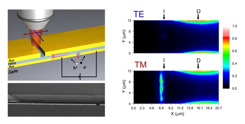 | Figure: Top left: schematic overview of the device, showing focused illumination of a slit in the waveguide using polarized light. This results in plasmon excitation of the waveguide for the red polarization and the generation of electron/hole pairs in the semiconductor. Bottom left: SEM picture of a typical device. Top/bottom right: Photocurrent scans for the “red” (bottom) and “blue” (top) polarization indicate a strong polarization dependence of the photoresponse – doi:10.1038/nphoton.2009.47 |