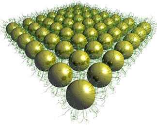 | Michael Campolongo/Luo Labs A schematic drawing of gold nanoparticles held together by tangled, hairlike strands of DNA. The thin sheets could prove useful in electronic applications. |